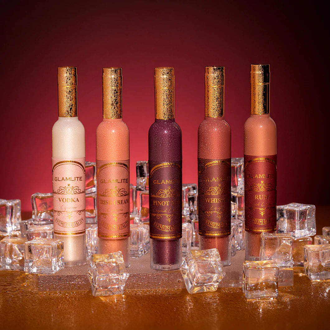 SOLD OUT ONLINE! Get it here!!! Glamlite brings you this fun 5PC lip kit that includes: shade Vodka - a transparent high shine lip gloss with a pearl finish; Irish Cream - a high shine nude lipgloss with coral undertones; Pinot Noir - a highly pigmented liquid lipstick with a cool berry undertone; Whiskey - a high shine lip gloss in a warm terracotta tone & Rum - a liquid lipstick in a creamy nude with warm undertones.