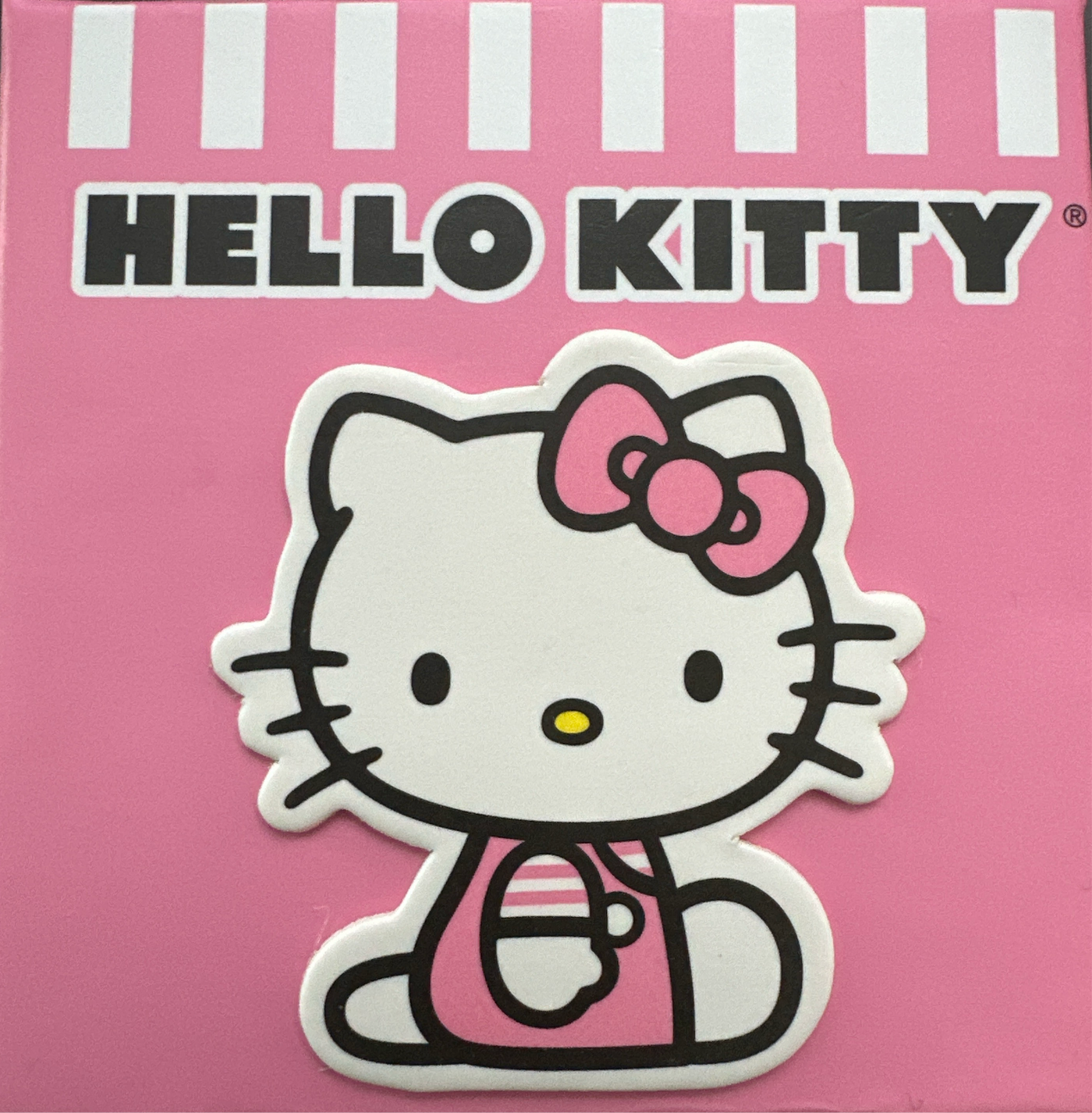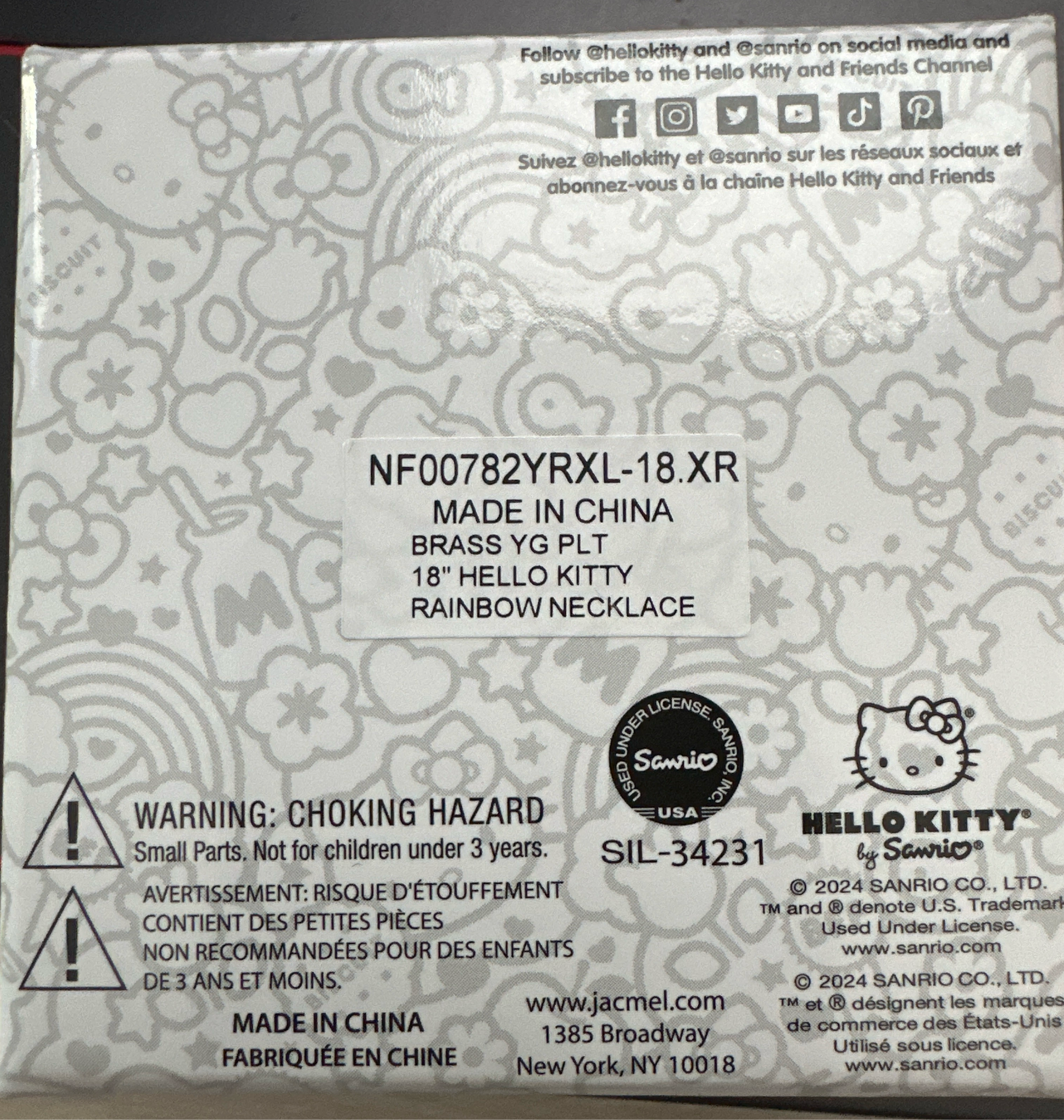 Best Price on Hello Kitty here! Gold plated necklace features Hello Kitty in teal jumpsuit sitting position with pink bow and rainbow in background. Comes with a pink and white gift box.
