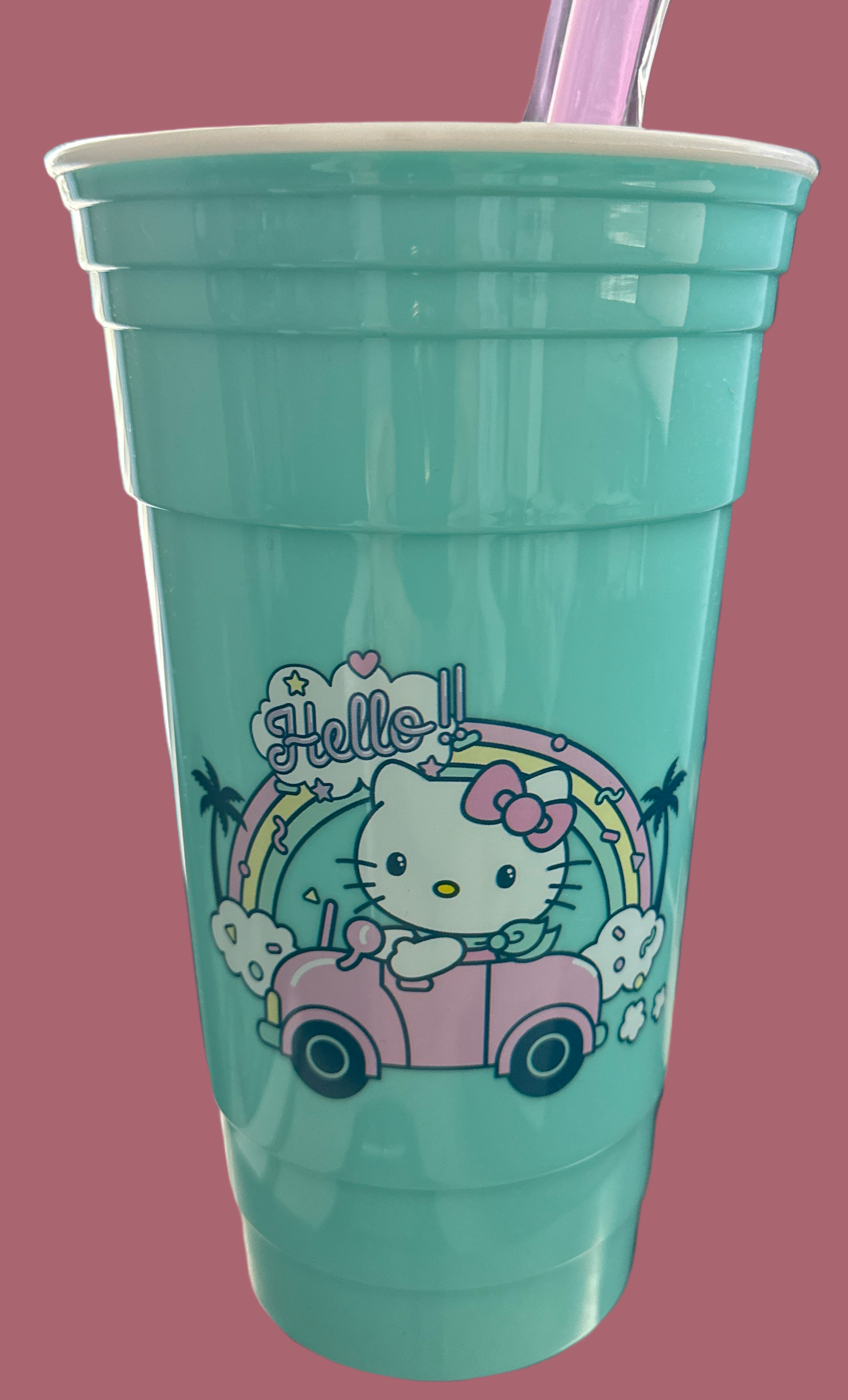 Best Price on Hello Kitty here! This adorable cup features Hello Kitty driving her pink car with rainbow and palm trees saying "Hello!!"