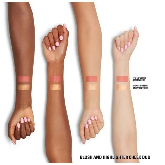 Kris Powder Blush & Highlighterek Duo features a powder formula, which is unexpected given the current craze for creams, but we're here for it! The blush, in the shade It's 5 O'Clock Somewhere (a dusty peach with subtle shimmer), and the highlighter, in Money Doesn't Grow On Trees (gold with a light gold shimmer), are both buildable in color. Together, they create a radiant, flushed glow.