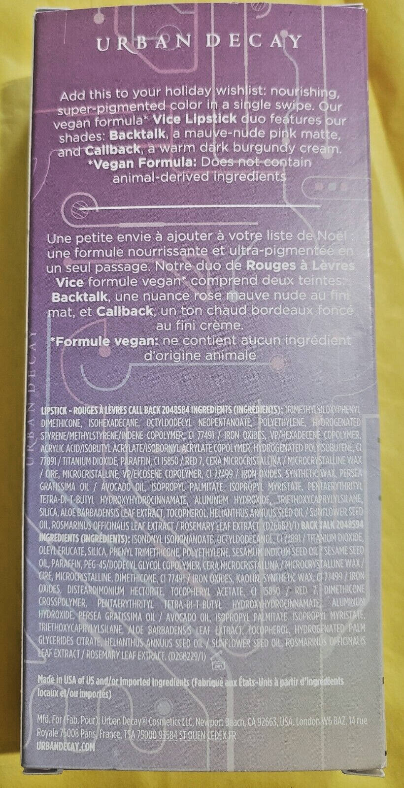 From the VICE lipstick line by Urban Decay, this set of TWO (2) together in a recently released gift set brings you CALLBACK, a warm, dark burgundy cream color, and BACKTALK, a mauve-nude pink matte color.